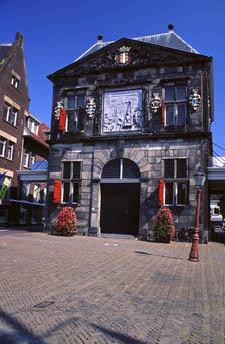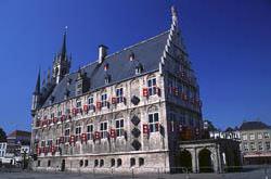 Gouda is a city which is famous for its cheesemarket. This is held on "De Markt" where the cityhall (on the left) and "De Waag" (left under) are also located. |
